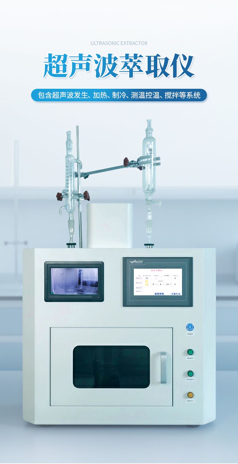 超聲波萃取儀使用超聲波技術(shù)然后結(jié)合運用低溫恒溫系統(tǒng)作為輔助,整套系統(tǒng)包含大功率超聲波 發(fā)生系統(tǒng)、加熱系統(tǒng)、壓縮機制冷系統(tǒng)、測溫控溫系統(tǒng)、攪拌系統(tǒng)等,在能控制反應體系溫度的 條件下,能有效促進反應物的高效率混合及促進催化化學反應。