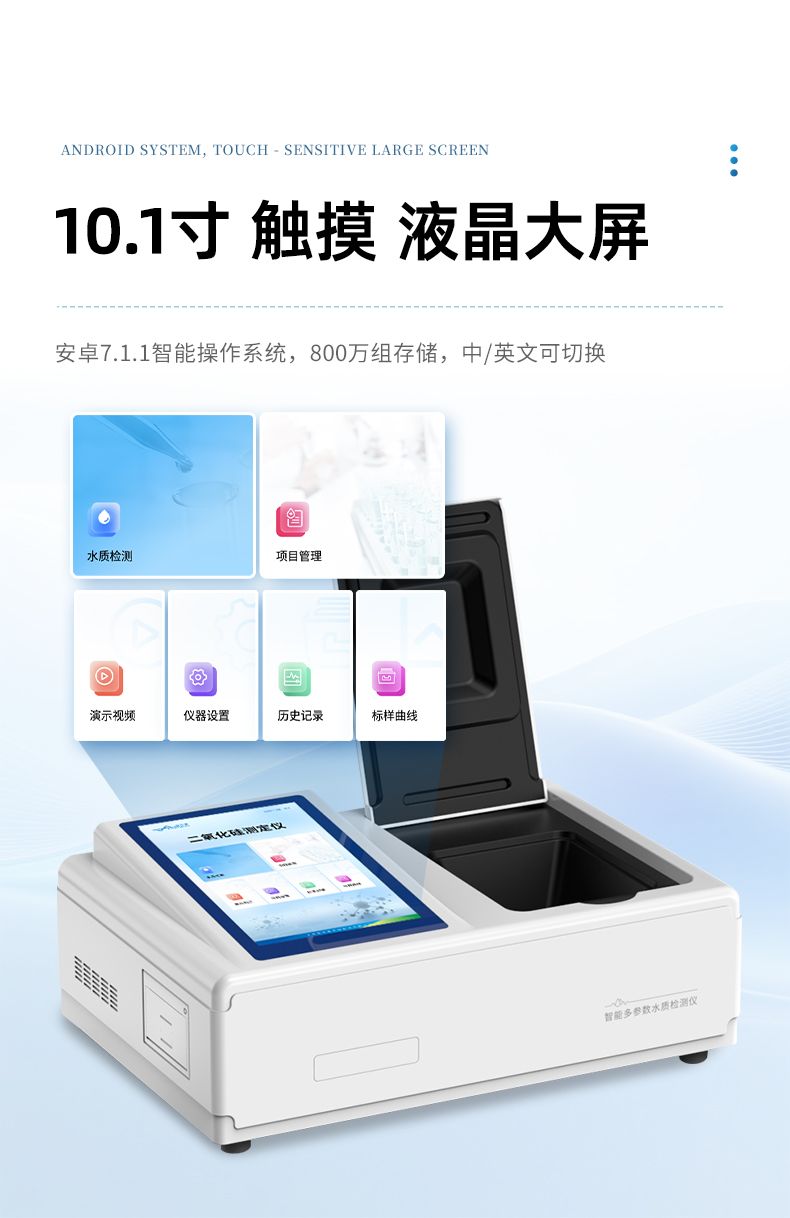 本儀器主要檢測水質二氧化硅濃度指標,兼具智能數(shù)據分析功能,圖表、列表顯示數(shù)據,分析一目了然;高清晰度彩色液晶觸摸顯示屏,Android智能操作系統(tǒng),中文顯示界面,中英文鍵盤,人性化操作,使用更簡單。