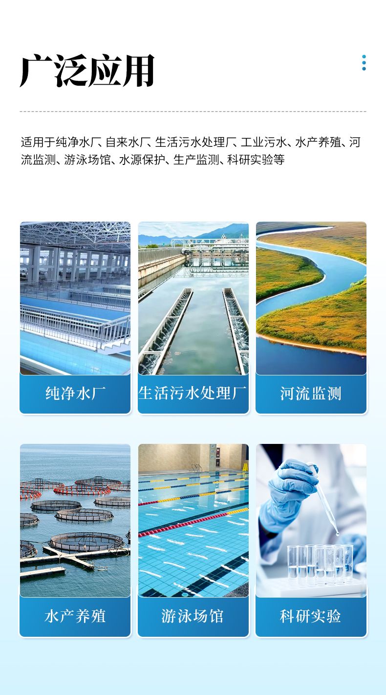 適用于純凈水廠、自來水廠、生活污水處理廠、工業(yè)污水、水產(chǎn)養(yǎng)殖、河流監(jiān)測(cè)、游泳場(chǎng)館、水源保護(hù)、生產(chǎn)監(jiān)測(cè)、科研實(shí)驗(yàn)等。