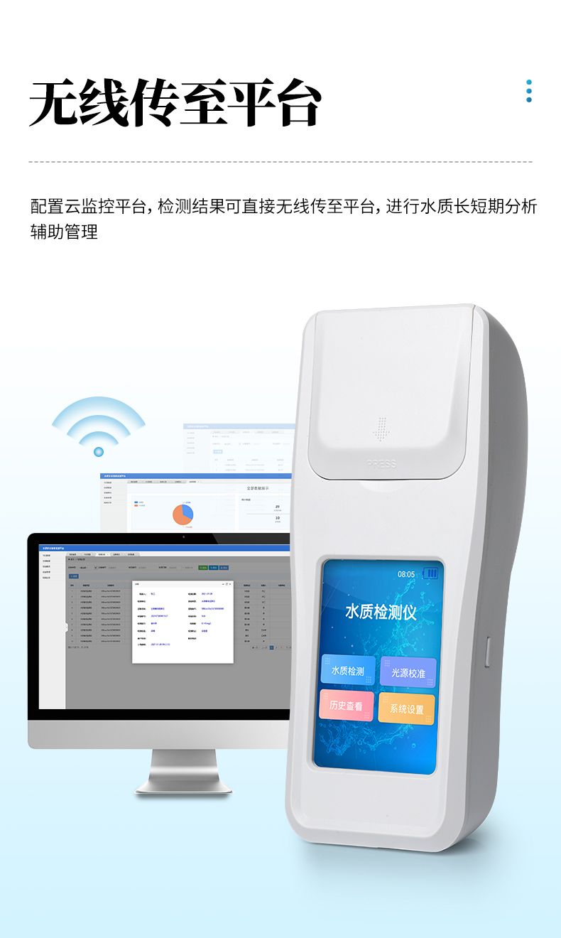 ②配置云監(jiān)控平臺(tái),檢測(cè)結(jié)果可直接無線傳至平臺(tái),進(jìn)行水質(zhì)長(zhǎng)短期分析,輔助管理。