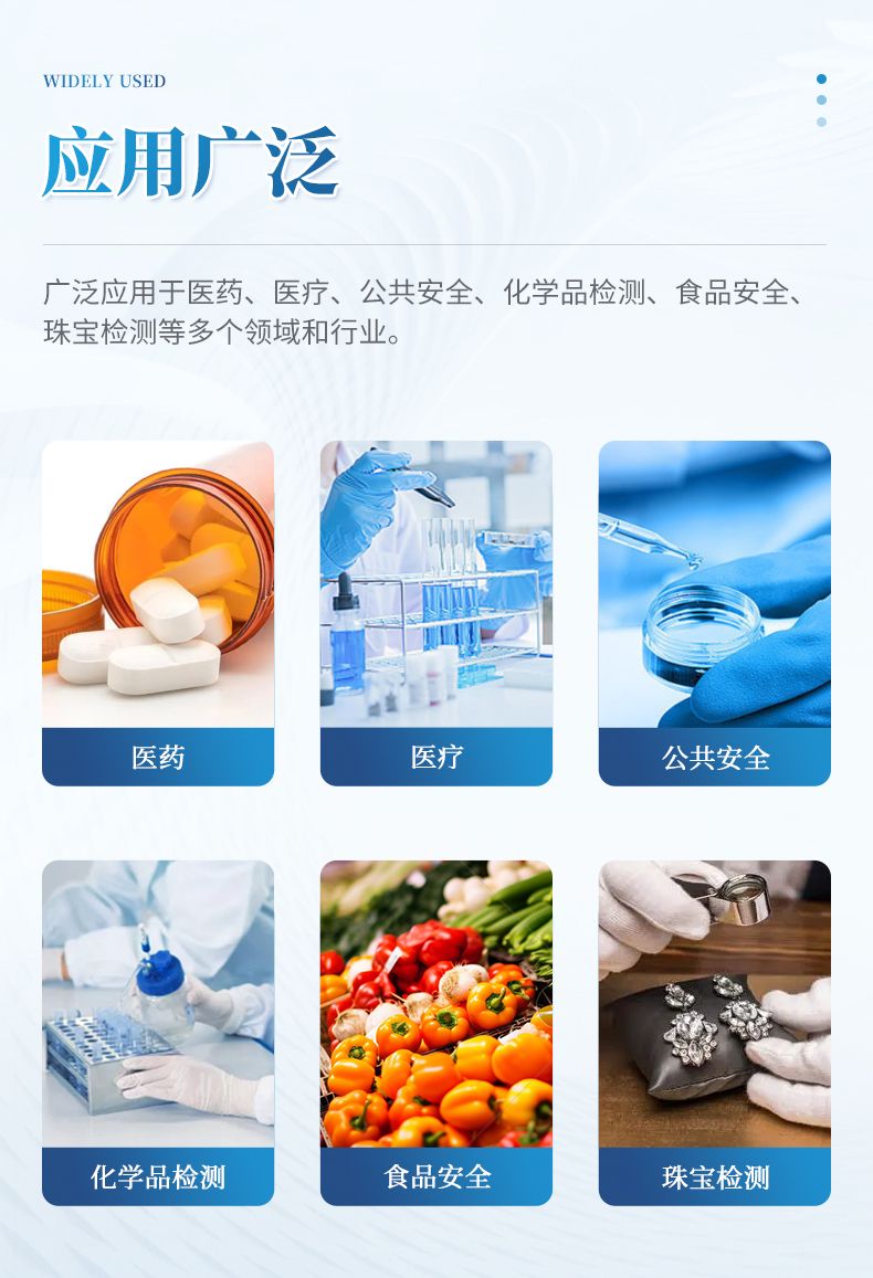 適用于現場快速檢測,廣泛應用于醫藥、公共安全、化學品檢測、食品安全、珠寶檢測及工業材料分析等多重領域和行業。