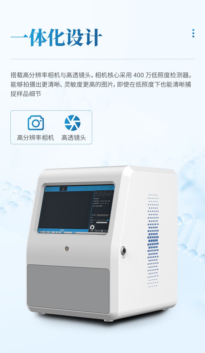 采用 13.3 寸觸摸屏控制,內存 16G,256G 固態硬盤,使儀器具有更強大圖像計算及 處理能力,配合圖像采集軟件操作簡捷直觀,軟件具有自動采集信號,并進行自己處理合 成功能;曝光模式分為自動曝光、手動曝光、以及自動定義曝光功能。配合圖像分析軟件 可對圖像信號進行定性定量分析。