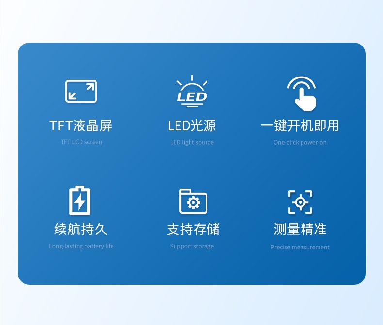 儀器支持存儲、查閱共200套測量數(shù)據(jù); 具有電池電量提示功能,設(shè)有5分鐘無按 鍵操作下的自動關(guān)機(jī)功能,續(xù)航持久;