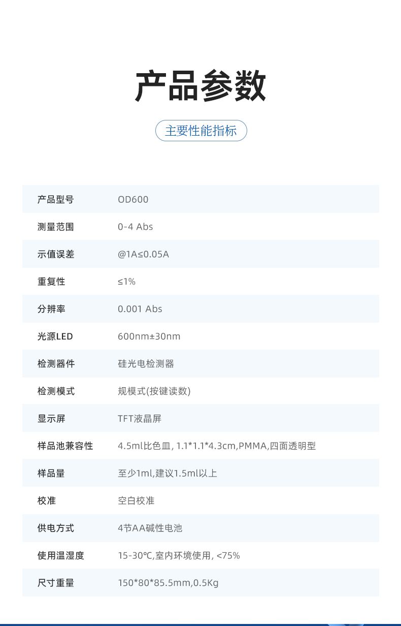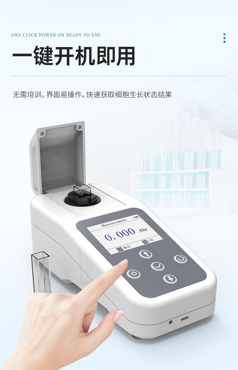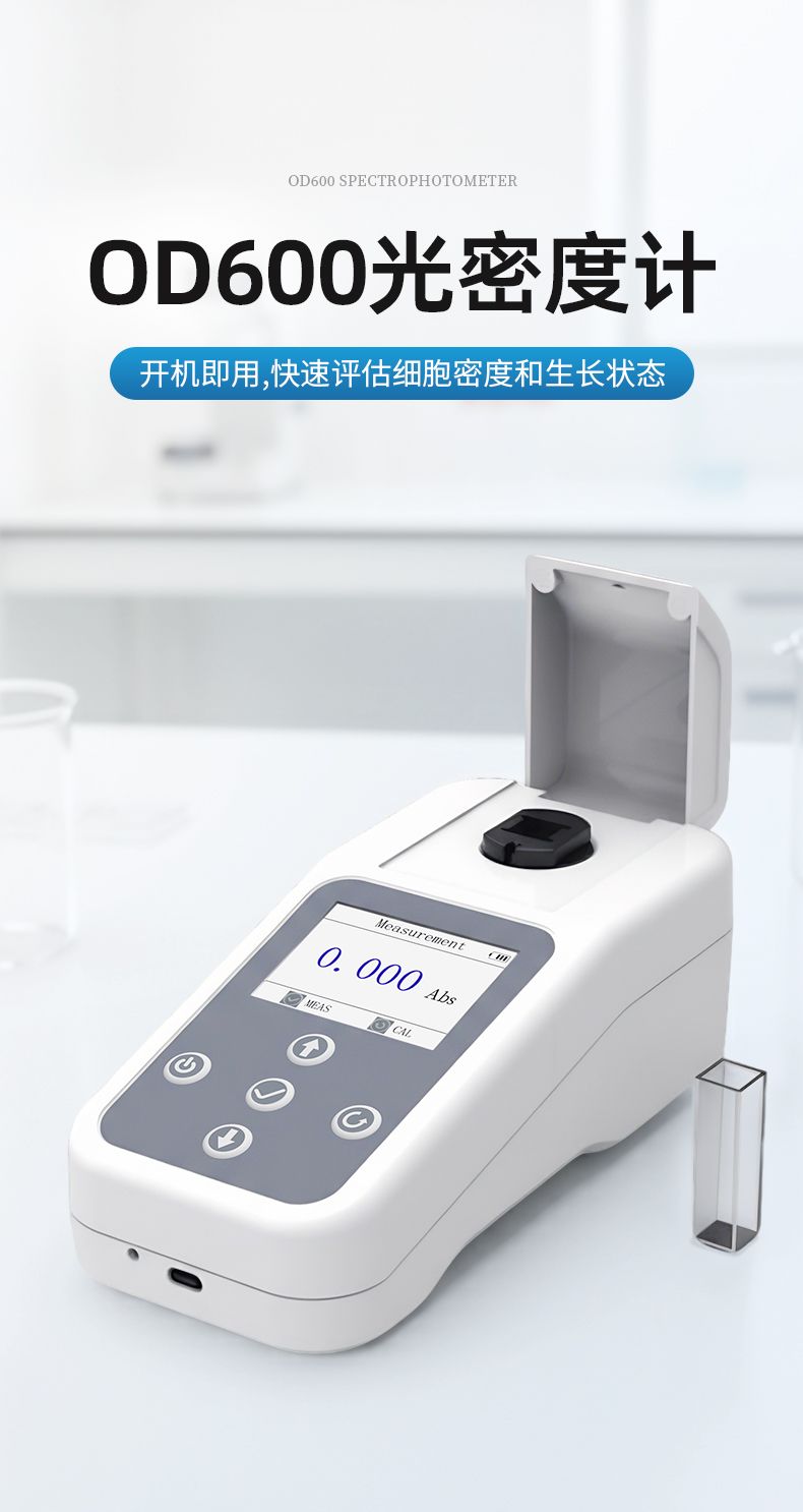 OD600是一款測量0-4Abs范圍內(nèi)細(xì)菌等培養(yǎng)液在600nm波長下的吸光度 (Optical Density,OD), 從而間接評估細(xì)胞密度和生長狀態(tài)的儀器。基于朗伯-比爾定律 (Lambert-Beer Law): 當(dāng)波長為600nm的光穿過樣品時,細(xì)胞會散射和吸收光線,吸光度 (OD 值)與細(xì)胞密度成正比。可廣泛應(yīng)用于微生物學(xué)、分子生物學(xué)、發(fā)酵工程和生物制藥等領(lǐng)域。