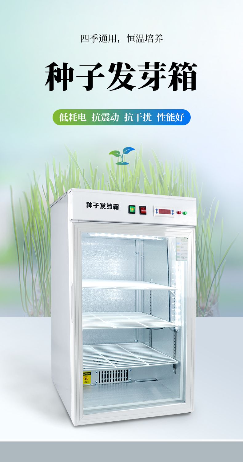 2、此箱可在不同地區(qū)不同季節(jié)使用不同的種子恒溫快速發(fā)芽,由于恒溫的作用,使種子的蛋白酶等化學(xué)物質(zhì)迅速分解反應(yīng),避免了溫差出芽造成的能量丟失,使種子出芽后抗病力強,提高幼苗免疫能力,縮短了種子的出芽的時間。經(jīng)該器械出的幼芽,芽苗質(zhì)量好,成活率高。