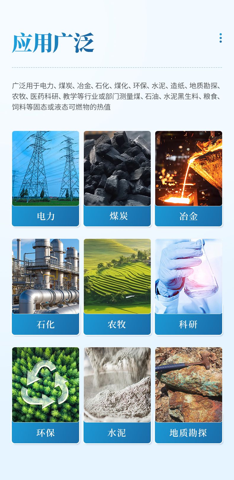 本儀器適用于電力、煤炭、冶金、石化、煤化、環(huán)保、水泥、造紙、地質(zhì)勘探、農(nóng)牧、醫(yī)藥科研、教學(xué)等行業(yè)或部門測量煤、石油、水泥黑生料、糧食、飼料等固態(tài)或液態(tài)可燃物的熱值。