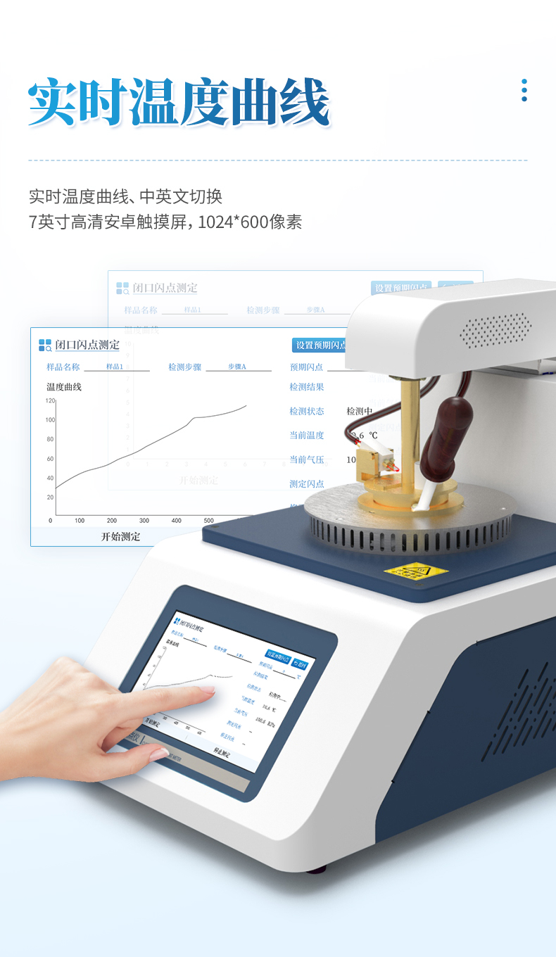 儀器按照GB/T 3536—2008方法規(guī)定的升溫曲線加熱,溫度接近預(yù)設(shè)閃點(diǎn)值時(shí)自動(dòng)點(diǎn)火,當(dāng)出現(xiàn)閃點(diǎn)和燃點(diǎn)時(shí)儀器自動(dòng)鎖定結(jié)果,并顯示和打印,同時(shí)啟動(dòng)風(fēng)機(jī)自動(dòng)對加熱器進(jìn)行冷卻。