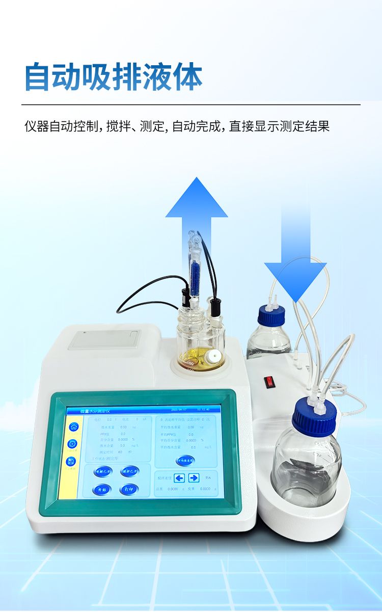 2.儀器具有試驗(yàn)結(jié)果存儲(chǔ)、打印、計(jì)算功能;樣品測定過程由儀器自動(dòng)控制,攪拌、測定60秒左右自動(dòng)完成,直接顯示測定結(jié)果;全密封滴定池瓶,避免試劑與人接觸,也避免環(huán)境濕度的影響;并具有自動(dòng)計(jì)算平均值和歷史記錄打印功能,能打印出百分含量、樣品編號(hào)、試驗(yàn)員、實(shí)驗(yàn)日期等內(nèi)容;儀器準(zhǔn)確度為:①水含量小于10微克水時(shí),測量值誤差小于2ug水;②水含量在10微克-1000微克水時(shí),測量誤差≤2ug水;③水含量在1000微克以上時(shí),測量值誤差≤0.2%(不含進(jìn)樣誤差);
